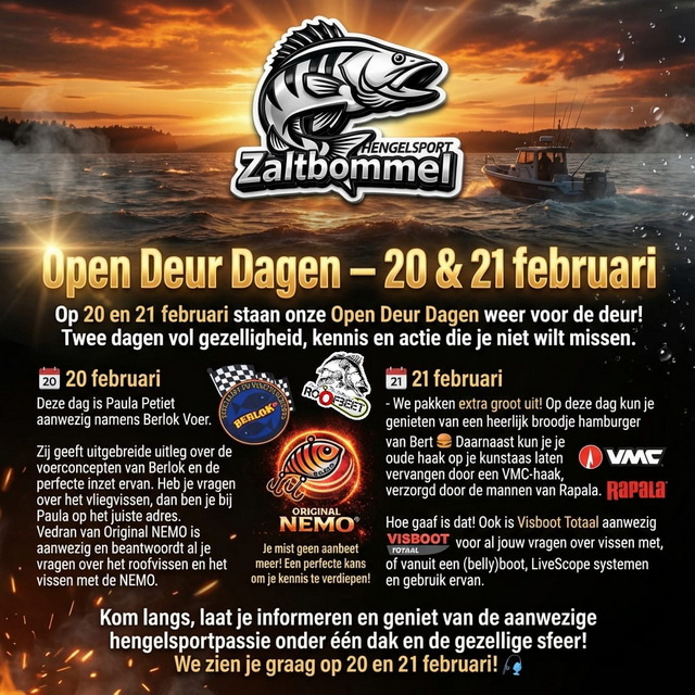 Tijdens onze open dagen op vrijdag 20-02-206 en zaterdag 21-02-2026 staan topmerken voor je klaar, waaronder Original NEMO Lure, Berlok Vislokvoeders, Zeck Fishing en Albatros Hengelsport. 2 dagen bomvol visserspraat en gezelligheid!