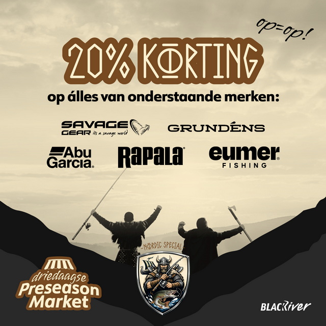 Drie dagen lang kun je profiteren van geweldige kortingen op Scandinavische merken. Op álle producten (zolang de voorrraad strekt) van zowel Savage Gear, Eumer Fishing, Rapala, Abu Garcia én Grundens pak je drie dagen lang 20% keiharde kassakorting! Voor alle producten van deze merken geldt: op = op en alléén geldig tijdens de Preseason Market bij Black River in Hasselt, Overijssel!