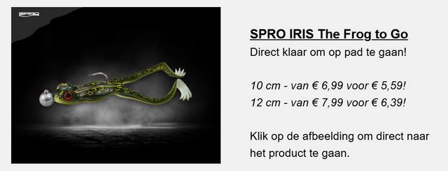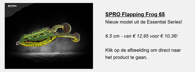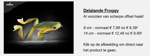 Hier kun je de komende week (zolang de voorraad strekt) alvast op inspelen met deze actie van DeRoofvisser: 20% korting op álle kikkers in ons kunstaas assortiment! En nee, dit is op zéker geen 1 april-grap, vanaf nú shop je de kikker die je wil met twintig procent voordeel.